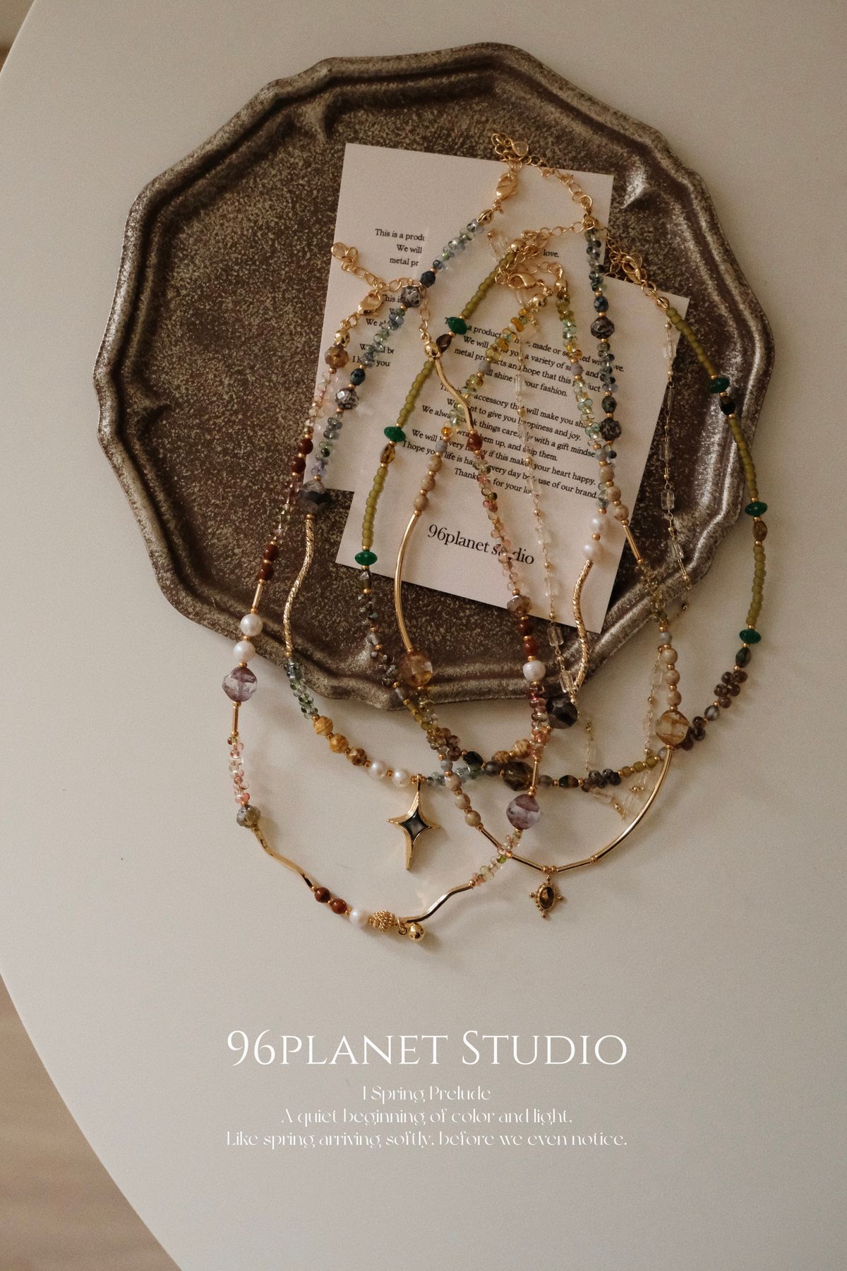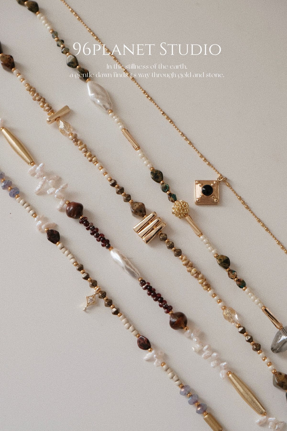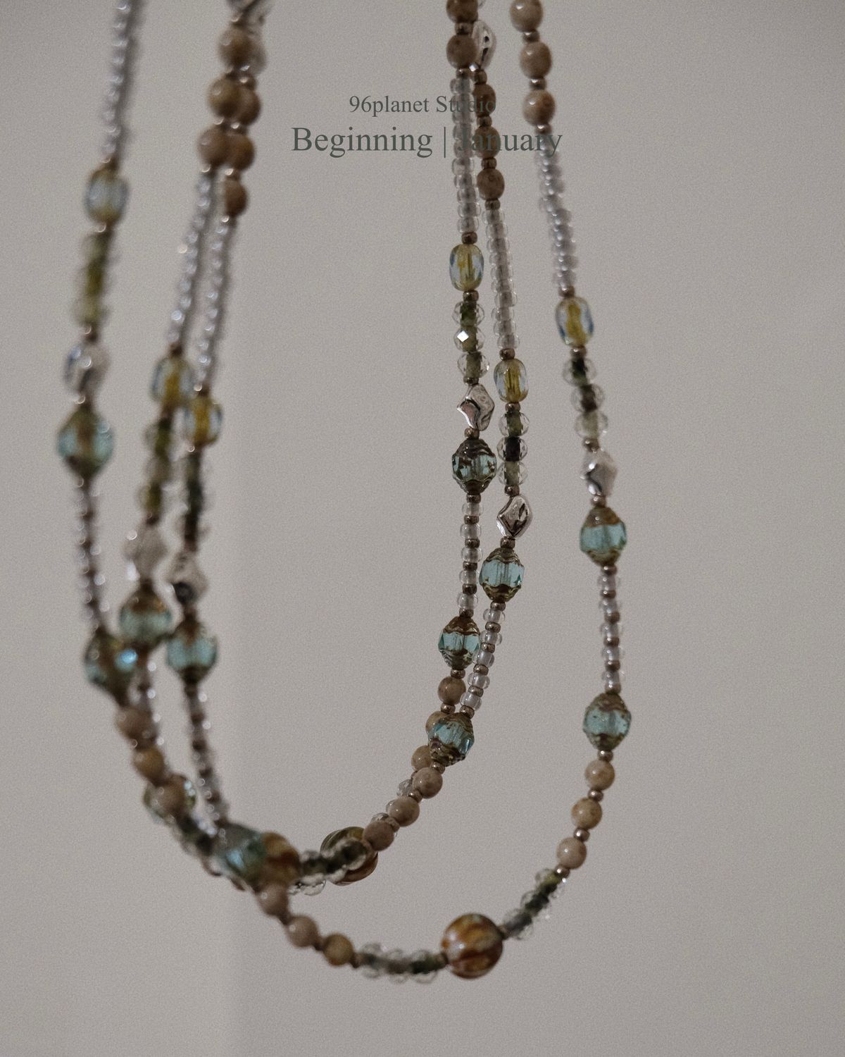 一月像一天裡的清晨—— 光還沒完全落下,世界尚未甦醒, 所有可能性都存在,但都還沒有被定義。 因此,這個系列選擇了銀色調作為核心。 銀色不像金色那樣明媚,它更接近時間本身: 冷靜、穩定,帶著一點距離感,卻能映照出細微的變化。 在設計上, 我們延續 96planet studio 標誌性的復古串珠結構, 透過不同尺寸、材質與冷色層次的排列, 讓作品在「秩序」與「流動」之間取得平衡。 這些作品刻意避免過於明確的主視覺焦點, 因為《起始|一月》想呈現的, 不是某一個瞬間的高光, 而是時間剛開始流動時,那種尚未成形的美。